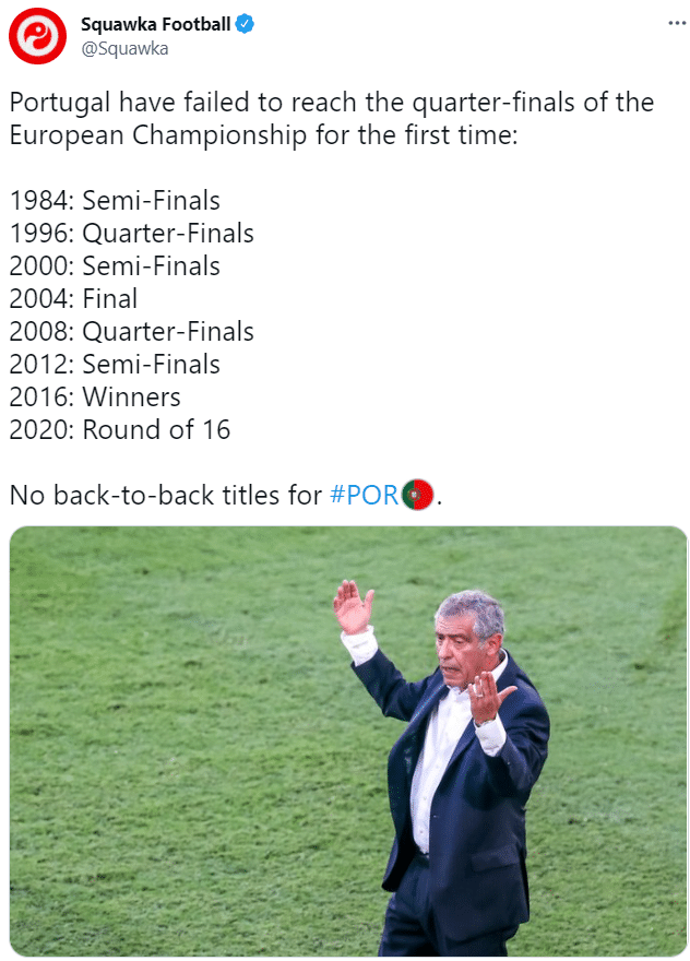 葡萄牙历史上曾8次晋级欧洲杯决赛圈,过去7次他们的最差成绩均为8强,这是球队历史上首次止步16强。