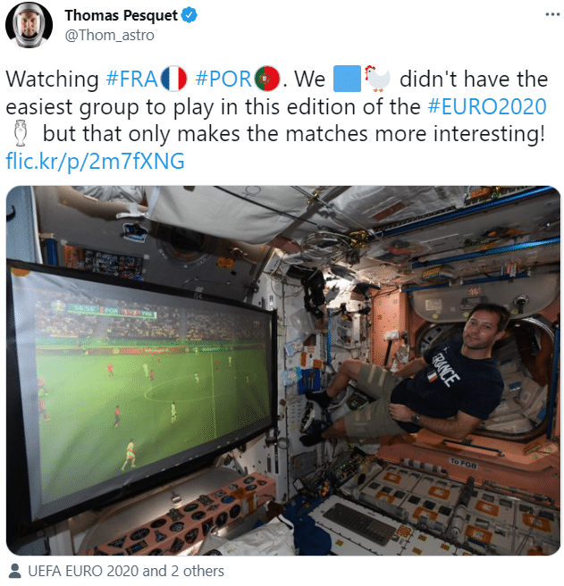 来源:24直播网06-25 10:0124直播网讯 法国宇航员托马斯-佩斯凯日前在推特上晒出自己在太空看欧洲杯的照片,并表示比赛很精彩。