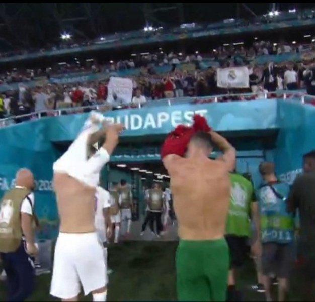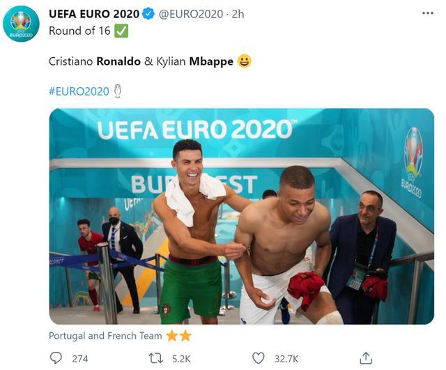 中场休息时,C罗与前队友本泽马搂着肩走入球员通道,两人顺道换了球衣,而全场比赛结束后,欧洲杯官推则晒出C罗与姆巴佩互换球衣谈笑的照片。
