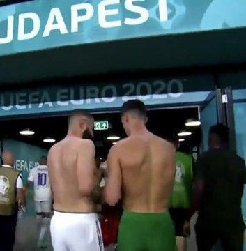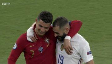 24直播网讯 今天凌晨,葡萄牙在欧洲杯中2-2战平法国,在中场休息和比赛结束后,C罗分别于本泽马和姆巴佩换了球衣。