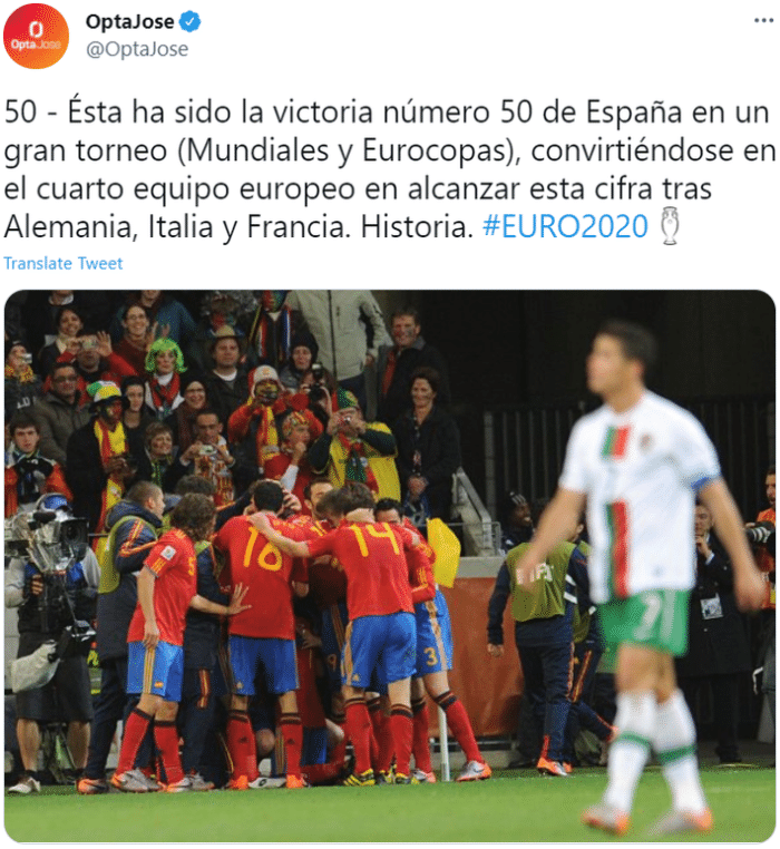 据OPTA统计,这是西班牙在世界杯和欧洲杯中的第50场胜利。