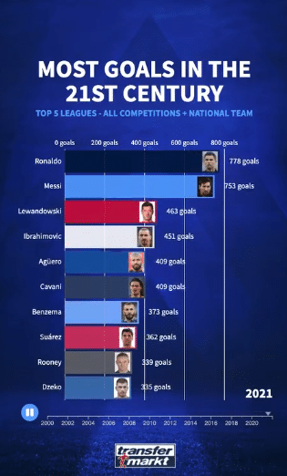 24直播网讯 德国转会市场今日盘点了21世纪至今的足坛射手排行榜,C罗第一,梅西第二。
