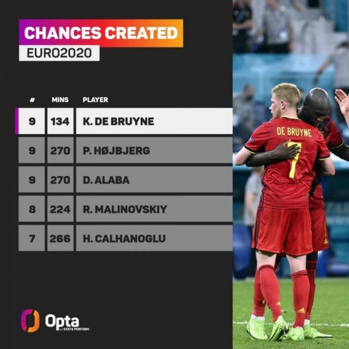 根据统计,德布劳内在本场比赛中创造了7次机会,创造本届欧洲杯单场纪录,而这只是他在本届赛事中的第一次首发。
