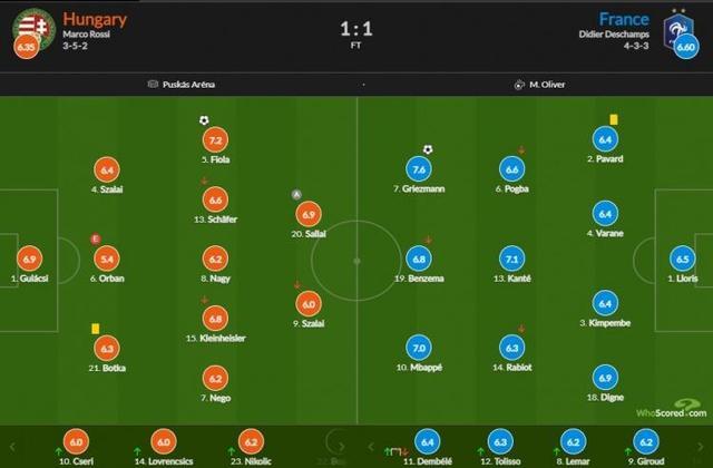 法国vs匈牙利评分:格列兹曼7.6最高