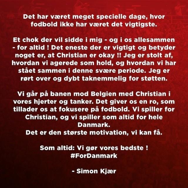 今天我们的身心要带着埃里克森一道迎战比利时队。这给予我们以平静安宁,让我们能专注这场比赛。我们要为埃里克森而战,并且一如既往为全部丹麦人而战。这是我们最大的动力。