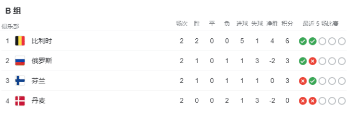 B组方面,比利时2战2胜提前晋级,俄罗斯和芬兰积3分,丹麦0分垫底,但下轮若赢球仍有出线希望。