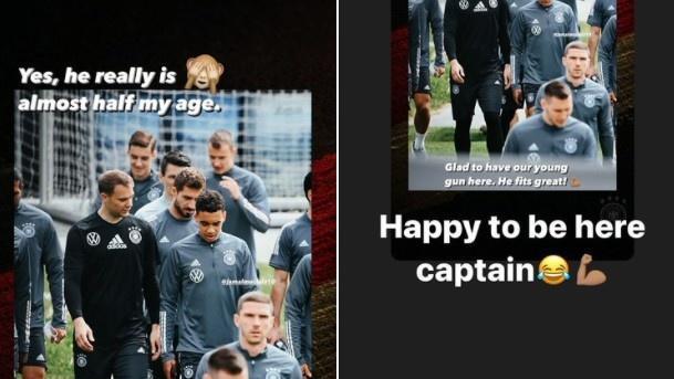 诺伊尔在个人社交平台晒出了俩人的合照,配文道:“很高兴年轻人也来到了这里,他适应得不错。他的年龄真的几乎只有我的一半。”小将穆西亚拉也对此做出了回应:“很高兴来到这里,队长”,并配上了“笑哭”和“努力”的表情。