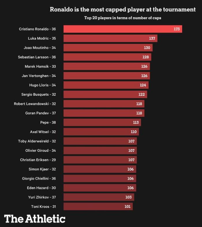 来源:24直播网06-05 11:0624直播网讯 近日,TheAtheltic盘点了本届欧洲杯参赛球员为国出战数据,为国出场数上C罗以173场独占鳌头,格纳布里则以场均0.71球的进球率领衔为国进球效率榜。