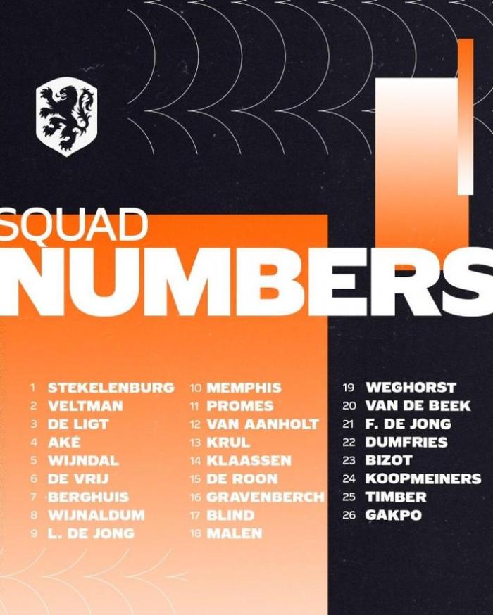 后卫:3-德里赫特(尤文)、6-德弗里(国际米兰)、22-邓弗里斯(埃因霍温)、2-维尔特曼(布莱顿)、25-尤里恩-廷伯(阿贾克斯)、4-阿克(曼城)、12-范安霍尔特(水晶宫)、17-布林德(阿贾克斯)、5-温达尔(阿尔克马尔)