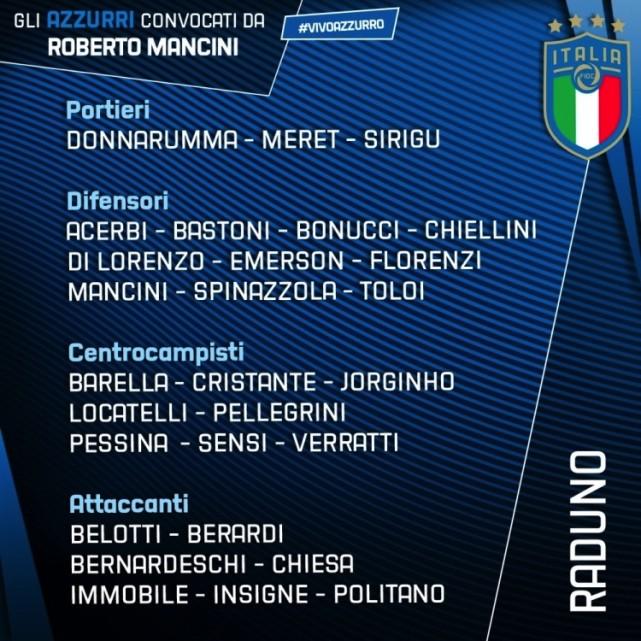 中场:巴雷拉(国米)、克里斯坦特(罗马)、若日尼奥(切尔西)、洛卡特利(萨索洛)、洛伦佐-佩莱格里尼(罗马)、佩西纳(亚特兰大)、森西(国米)、维拉蒂(巴黎)