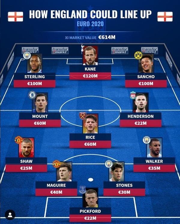前锋:斯特林(曼城,1亿欧)、凯恩(热刺,1.2亿欧)、桑乔(多特,1亿欧)