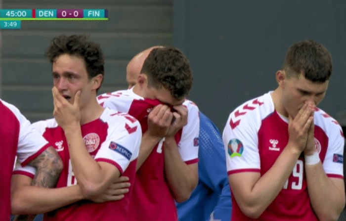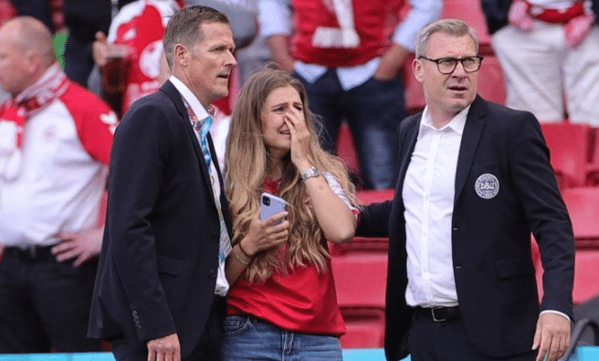 上半场的比赛进行到第42分钟的时候,埃里克森突然栽倒在地上,这一幕让人看得十分揪心,在没有任何身体对抗的情况下,他直接栽倒在地,场上的球员一看情况不对,第一时间呼叫场边的队医进入到场内,队医对埃里克森进行心肺复苏术治疗,而丹麦的球员也是围住了埃里克森,现场的很多球迷已经在哭泣,而镜头给到场边的时候埃里克森的妻子已经泣不成声,自己最亲的人突然倒下了,一切都是来得那么突然,没有任何的征兆,克亚尔、舒梅切尔不断的在安慰着她。随后担架车进入了场内,埃里克森被医疗人员抬出场,而丹麦队的球员也跟着离场了。
