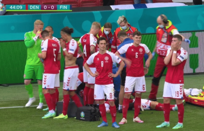 两队比赛中断,欧足联官方消息,由于比赛中出现医疗紧急情况,丹麦vs芬兰比赛暂停,很多人都在为埃里克森祈祷,祈祷他没有什么大碍,随后网上有消息爆出,埃里克森已经恢复了意识,情况很定,随后欧足联发布消息:埃里克森已经被转移到医院,情况稳定。丹麦官方:埃里克森已经苏醒,将在接下来几小时接受进一步检查。
