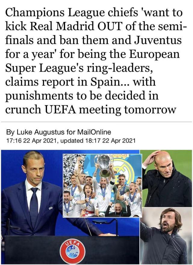 曝欧足联重罚皇马尤文:欧冠禁赛1年!皇马踢出4强,本周五开会决定