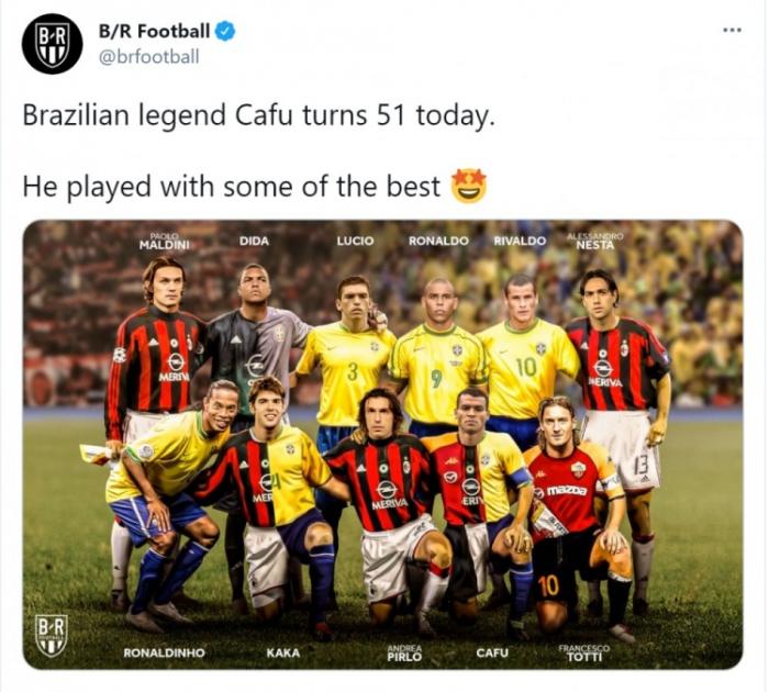 如图,这个是BR给出的卡福队友最佳阵容,其中门将位置上是巴西国家队和米兰的门将,后防线上分别是卡福自己、卢西奥、内斯塔和马尔蒂尼;其中卢西奥是卡福国家队的队友,内斯塔和马尔蒂尼是卡福在米兰的队友。中场方面分别是里瓦尔多、皮尔洛、卡卡和小罗,这四人小罗、里瓦尔多和卡卡是卡福国家队的队友,皮尔洛是卡福米兰的队友。而前锋线上是大罗和托蒂,其中大罗是卡福国家队的队友,而托蒂是卡福在罗马效力时期的队友。