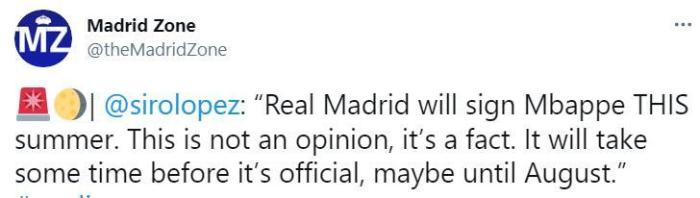 该记者表示,皇马会在今夏签下姆巴佩。这不是观点,这是事实。官方宣布还要等一段时间,也许要等到8月。
