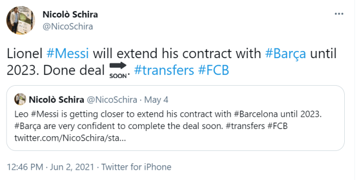 而斯基拉称,梅西已经完成了续约,他与巴萨的新合同将持续到2023年。