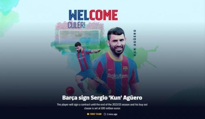 巴萨宣布阿圭罗签约至2022-23赛季结束,违约金为1亿欧元。今夏阿圭罗和曼城的合同结束后,自由加盟巴萨。