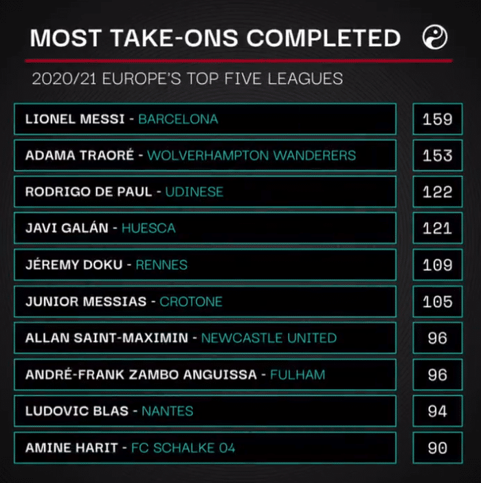 来源:24直播网05-26 11:0924直播网讯 Squawka统计了2020-21赛季五大联赛球员的过人次数排行榜,梅西159次成为欧洲过人王,狼队边锋阿达玛-特劳雷153次紧随其后,乌迪内斯攻击手德保罗122次排名第三。