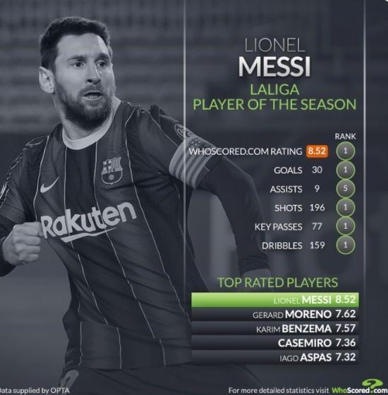 在WhoScored的评分系统中,梅西2020/21赛季西甲场均8.52分位列榜首。