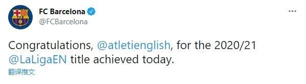 巴萨官方发布动态,恭喜马竞赢得20-21赛季西甲冠军!西甲收官战,马竞2-1逆转巴拉多利德,以2分优势力压皇马夺冠。