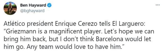 塞雷佐说:“格里兹曼是一位伟大的球员,我希望我们能把他签回来,但我不认为巴萨会放他离开,任何球队都很乐意拥有他。”