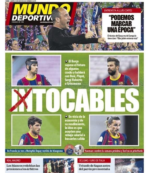 这家巴萨喉舌打出大标题《非卖品?可卖品!》,并且在导语中表示巴萨正在评估这四位球员在球队中的未来,拉波尔塔将会与他们进行对话。考虑到球员的薪资水平和球场上的表现,巴萨对他们的计划是,要么让球员接受降薪,要么为他们另寻出路。