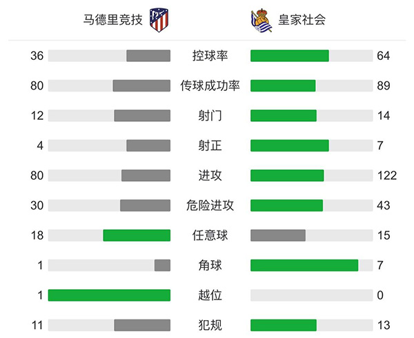 全场比赛结束,马德里竞技2-1皇家社会。