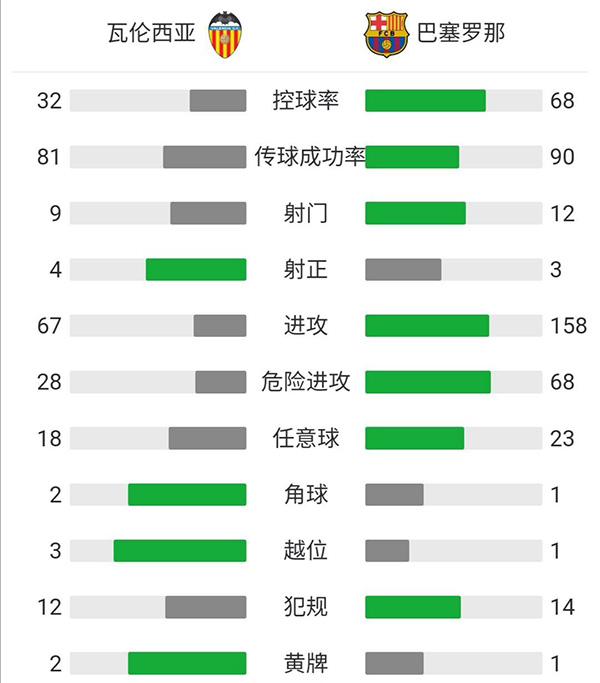 全场比赛结束,巴塞罗那客场3-2战胜瓦伦西亚。