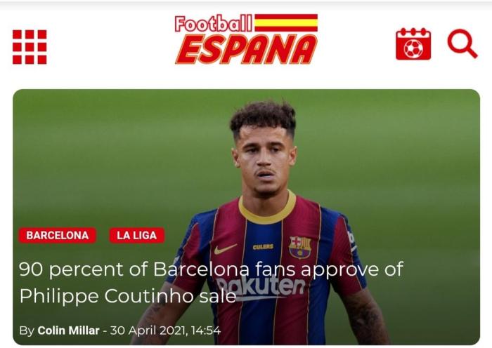 民意! 近90%巴萨球迷赞成将库蒂尼奥交易