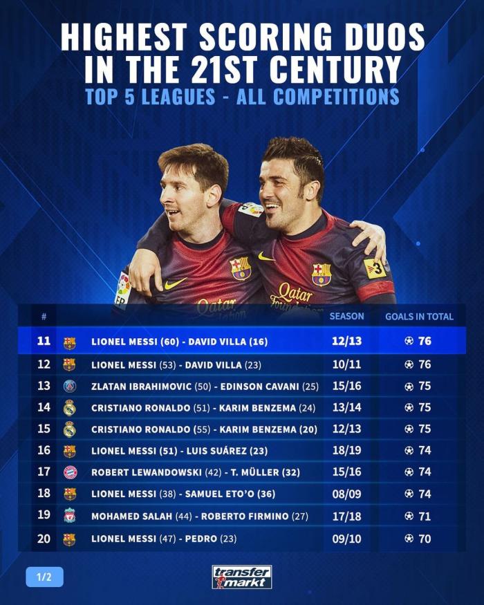 来源:24直播网04-25 20:1024直播网讯 足坛想要进球,不光需要依靠自己,还需要依靠队友。而许多球队都有一些经典的进攻组合,那么在本世纪,在欧洲足坛,哪些进攻二人组是足坛最好的进攻二人组呢?近日,德国权威媒体《转会市场网》就盘点了本世纪足坛单赛季进球最多的二人组,其中梅西五次上榜,C罗四次上榜。那么还有一次上榜的是谁呢?话不多说,一起看数据吧!