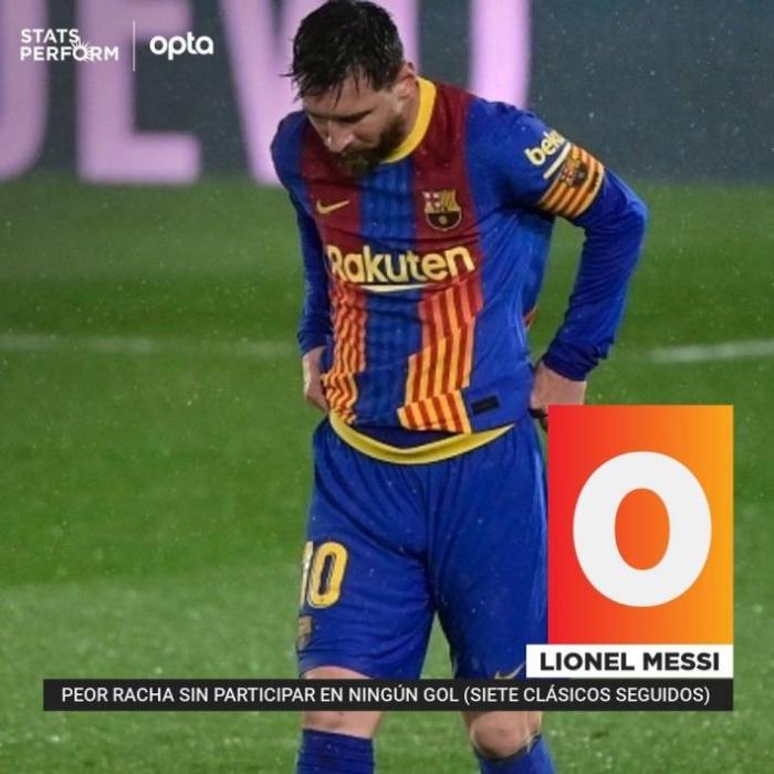 据Opta数据统计,梅西追平了自己在联赛国家德比中7次射门未能进球的最差纪录(射门次数最多却没能进球),此前他是在2005年11月的国家德比中创下的这个纪录。