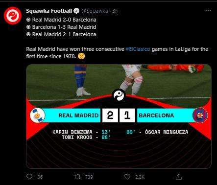赛后据Squawka统计,皇马在西甲中面对巴萨已经取得了三连胜(本赛季首回合皇马客场3-1战胜巴萨,上赛季第二回合皇马主场2-0战胜巴萨),这是皇马在西甲历史上自1978年以来首次。