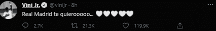 ,赛后维尼修斯发推表白皇马。
