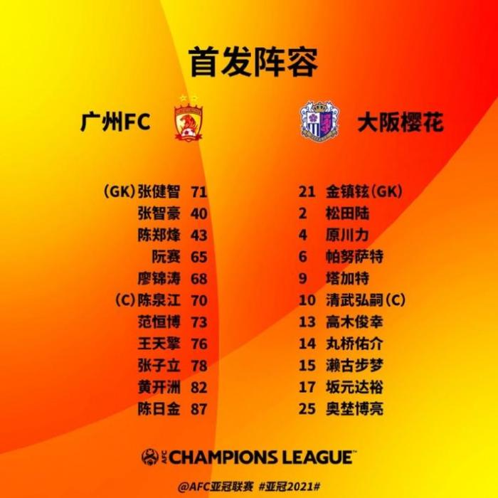 亚冠-广州vs大阪樱花首发: 广州青年军出战