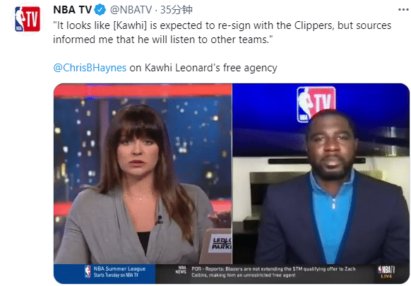 海耶斯在节目中表示:看起来莱昂纳德预计会和快船重新签约,但他不会在第一天就签约快船,他会听取其他球队的报价。