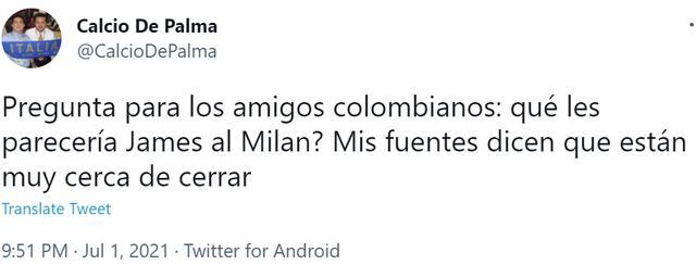 Vito De Palma在其推特上写道:“J罗是否会去米兰?我得到的消息是米兰已经非常接近签下他。”