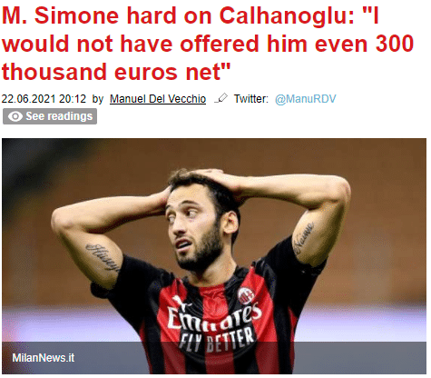 这让许多米兰球迷感到愤怒,马尔科-西蒙尼就说道:“我不怕得罪人,而这就是我的想法。如果我是米兰,我甚至不会给恰尔汗奥卢30万欧元术后年薪,我只会给他30万欧元税前年薪。”