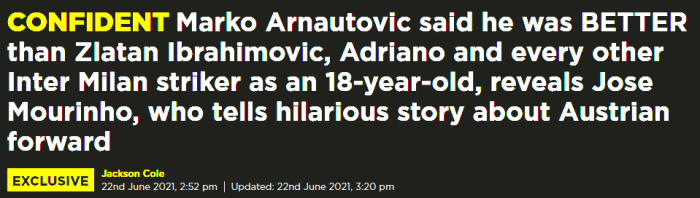 来源:24直播网06-23 11:4124直播网讯 穆里尼奥最近接受了talkSPORT电台采访,他表示阿瑙托维奇一直是一个非常有自信的小伙子,在18岁时就曾表示自己比伊布和阿德里亚诺等人都强。