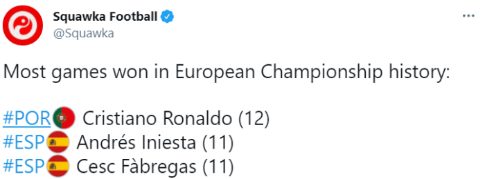 自此,C罗超越了伊涅斯塔和法布雷加斯,成为了欧洲杯正赛取胜次数最多的球员,是真正的赢家。