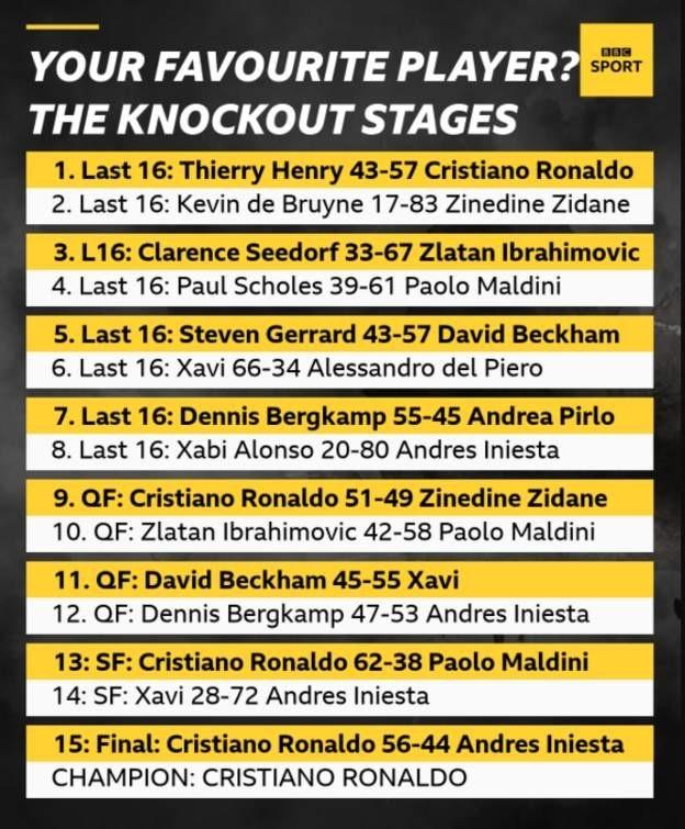 入选候选名单的球员有很多,齐达内、亨利、罗纳尔多、德布劳内、伊布、斯科尔斯等诸多球星全部入选了候选名单,C罗在第一阶段以57%比43%的选票战胜亨利,随后他又以51%比49%的选票险胜齐达内,跟着C罗以62%比38%的选票战胜马尔蒂尼,而在最后的评选中,C罗以56%比44%的选票力压西班牙球星伊涅斯塔,最终C罗成为了BBC评选的本世纪欧洲最受欢迎的球员。