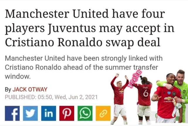 尽管C罗已经36岁,但曼联主帅索尔斯克亚依然希望这位前队友能加盟,与他再次合作。据悉,曼联为了回购C罗给尤文俱乐部提供了一份新的方案,方案依然涉及的将是球员交换。曼联愿意用阵中的博格巴、马夏尔、范德贝克、德赫亚4人中的任意一位,与尤文交换C罗。
