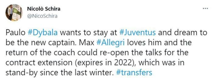 迪巴拉想要留在尤文,同时他梦想成为新队长。阿莱格里很喜欢他,他的回归可能让俱乐部与迪巴拉重启在去年冬天就陷入僵局的续约谈判。