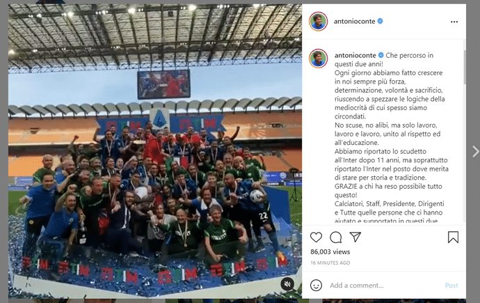 孔蒂写道:“这是两年无与伦比的旅程,我们每天都会变得更加强大,更有决心和意志力,更加懂得牺牲精神的含义。这让我们设法打破的曾经限制我们的平庸逻辑,实现了突破。