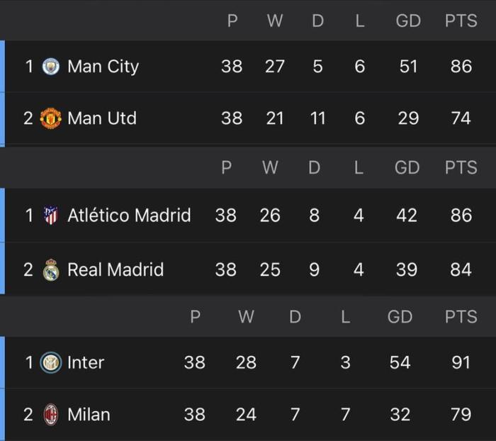 24直播网讯 2020-21赛季五大联赛均已落下帷幕,在米兰锁定意甲亚军之后,本赛季英超、意甲和西甲的冠亚军均为同城球队。