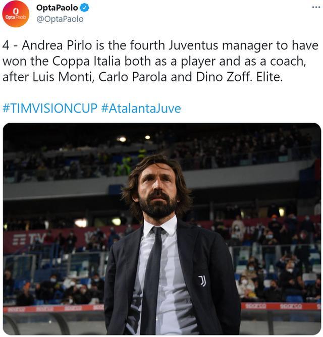 今天凌晨,尤文图斯在意大利杯决赛中2-1击败亚特兰大,自此,皮尔洛作为球员和教练都随斑马军团夺得这一荣誉。