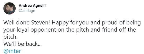 阿涅利说到:“干得漂亮!张康阳,真为你感到高兴,很荣幸可以成为你对对手和朋友。我们尤文也会再回来的。”