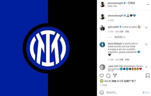 本场比赛赛后,国米主席张康阳在Ins上晒出国米队徽,并配上