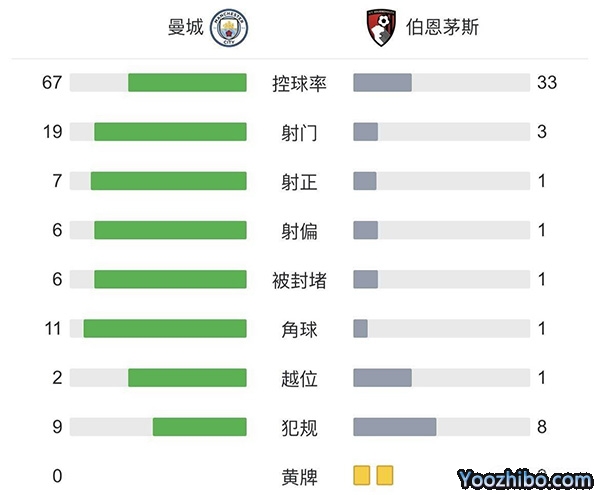 第30分钟,德布劳内前场右侧得球杀入禁区后右脚外脚背打门将球打进,曼城2-0伯恩茅斯。