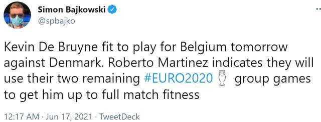 而巴考斯基表示,德布劳内将能够赶上北京时间6月18日凌晨比利时对阵丹麦的比赛。在剩余的两场小组赛中,比利时主帅罗伯托-马丁内斯将给德布劳内机会找回比赛体能和节奏。